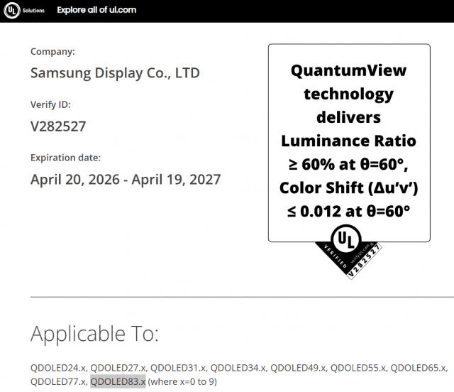 지난 23일(현지시간) 플랫패널HD(FlatpanelsHD) 등 외신은 한 X(옛 트위터) 사용자(Fury)를 인용해 삼성디스플레이가 안전과학업체 UL솔루션즈 '퀀텀뷰' 평가를 마친 QD-OLED 제품 크기가 24, 27, 31, 34, 49, 55, 65, 77, 83인치 등이라고 보도했다.