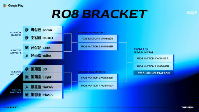 8강 대진은 16강 종료 직후 조추첨을 통해 확정됐다. 먼저 첫 경기는 오는 27일 오후 7시 박상현(Z)과 조일장(Z)이 맞붙는다. 속도감이 빠른 저그 동족전이 진행되는 만큼 경기 초반부터 치열한 빌드 싸움과 교전이 기대된다.