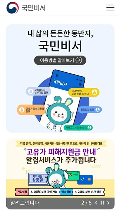 네이버와 카카오는 직접 조회 기능을 제공하지는 않지만, 네이버의 경우 앱 검색창에 국민비서를 입력한 후 알림 신청 페이지에 접속하고, 알림 항목에서 고유가 피해지원금을 선택하면 신청 가능하다.