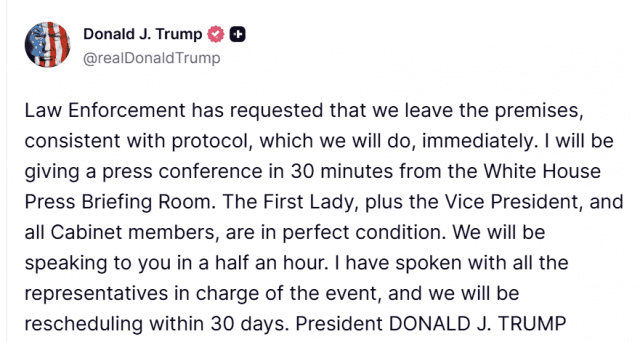 그는 또 “워싱턴DC의 꽤 파란만장한 밤에 비밀경호국과 법 집행 기관이 훌륭한 임무를 수행했다. 그들은 신속하고 용감하게 대응했다”고 말했다.