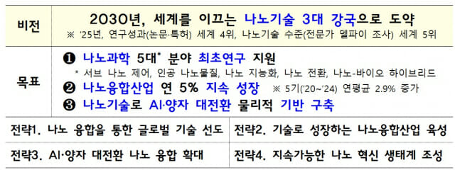 이번 나노 계획에서는 우리나라가를나노기술 3대 강국으로 도약하기 위한 연구개발, 산업화, AI․양자 융합, 생태계 부문 전략과 13개 중점 추진과제를 제시했다.
