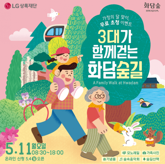 참여 가족은 복합문화공간 '화담채' 전시 관람을 시작으로, 가족사진을 촬영하고 숲속 음악회를 즐길 수 있다. LG상록재단은 수국 화분을 기념품으로 제공한다.