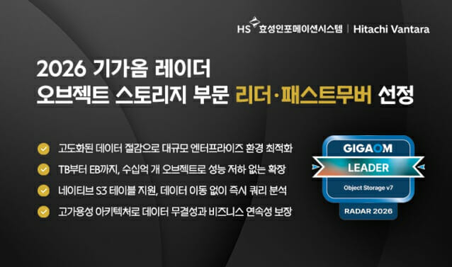 히타치 밴타라가 시장분석기관 기가옴이 발표한 '2026 기가옴 레이더 오브젝트 스토리지' 보고서에서 '리더 및 패스트 무버'로 선정됐다. 보고서는 회사 'VSP 원 오브젝트'를 대규모 엔터프라이즈 환경에 최적화된 SW 정의 오브젝트 스토리지로 높이 평가했다.