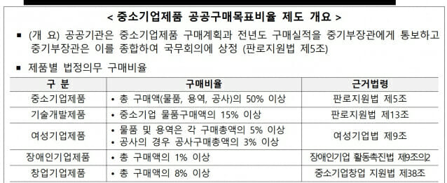 28일 중기부는 이날 열린 국무회의에서 이 같은 내용을 보고했다. '중소기업제품 구매촉진 및 판로지원에 관한 법률(이하 판로지원법)' 제5조에 따라 847개 공공기관(국가기관, 지자체, 교육청, 공기업, 지방의료원 등)은 총 구매액의 50% 이상을 중소기업제품으로 구매해야 한다.