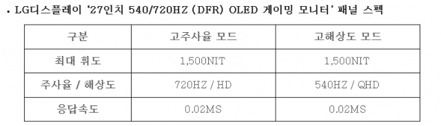 고주사율 모드는 1인칭 슈팅 게임(FPS)이나 레이싱 게임처럼 화면 전환이 빠른 게임에서 진가를 발휘한다. 현존 최고 수준인 720Hz 주사율, HD 해상도를 지원해 잔상이나 번짐 현상을 차단한다. 고해상도 모드는 화려한 그래픽 기반 게임에 최적화한 시각 경험을 제공한다. QHD 해상도, 540Hz 주사율을 동시 구현한다. LG디스플레이는 주사율이 500Hz를 넘으면 화질이 떨어지는 기존 한계를 극복하기 위해 독자 알고리즘을 적용했다.