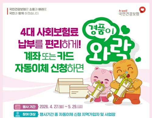 한편 국민건강보험공단은 4대 사회보험료(건강보험‧국민연금‧고용보험‧산재보험) 자동이체 이용 확대와 국민 납부 편의성을 위해 자동이체 신규 신청자를 대상으로 5월29일까지 이벤트를 진행한다.