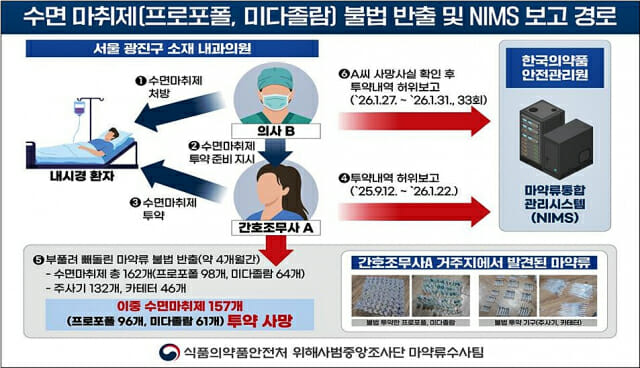 식약처 의료용마약류 전담수사팀은 주거지에서 발견된 프로포폴이 의사 B씨가 운영하는 내과의원에 공급됐던 것을 확인하고 압수수색 등 강제수사를 진행한 결과, 간호조무사 A씨는 2025년 9월12일부터 사망 전인 2026년 1월 중순까지 약 4개월간 자신이 근무하는 의원에서 내시경 검사에 사용하는 마약류를 실제 사용량보다 부풀려 허위 보고한 후 프로포폴 98개, 미다졸람 64개 등을 빼돌린 것을 확인했다.