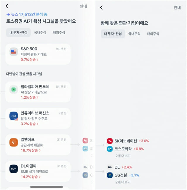 시장 분석 서비스 ‘AI 시그널’은 뉴스와 공시 데이터를 분석해 시장 변동 원인을 도출하고 요약한다. (사진=토스증권)