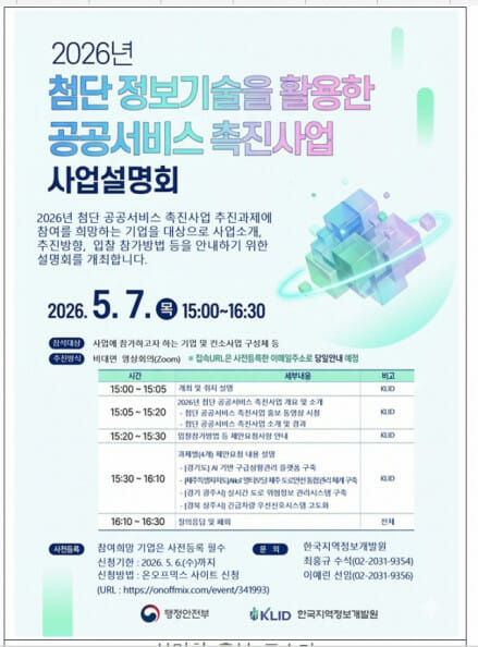 한국지역정보개발원(이하 개발원)은 ‘2026년 첨단 정보기술 활용 공공서비스 촉진사업(이하 첨단 공공서비스 촉진사업) 설명회’를 다음달 7일 오후3시 온라인으로 진행한다고 밝혔다.