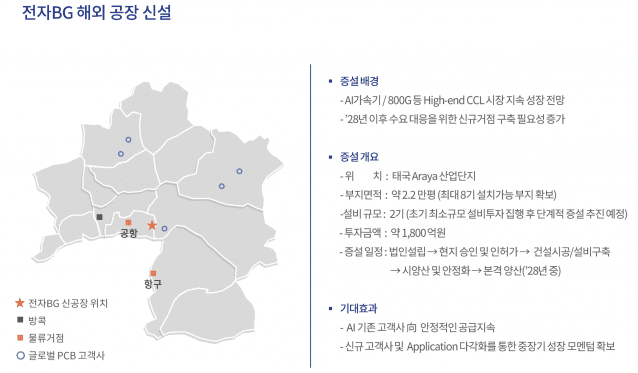 신규 설립되는 태국 공장에서는 AI 인프라 및 네트워크 장비용 고성능 CCL을 주력으로 생산할 예정이다. 글로벌 수요 확대 추세에 힘입어 높은 성장세를 보일 것으로 기대하고 있다.