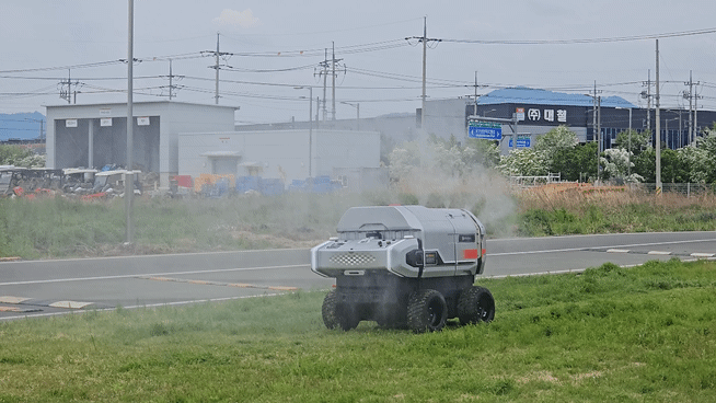 공장 밖 시연장에서는 올 상반기 출시 예정인 예초 로봇도 모습을 드러냈다. 잡초가 무성한 잔디밭 위로 로봇이 지나가자 자란 풀들이 일정한 높이로 잘려 나갔다. 로봇은 넓은 벌판 위에 설정된 라인을 따라 자율주행하며 예초 작업을 수행했다. 그 뒤로는 방제 로봇이 따라붙어 약재를 살포했다.
