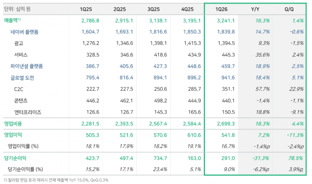 사업 부문별 매출액은 ▲네이버 플랫폼 1조 8398억원 ▲파이낸셜 플랫폼 4597억원 ▲글로벌 도전 9416억원이다.