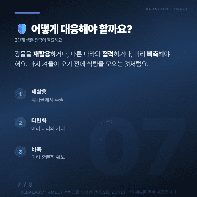 그래서 전문가들은 3단계 생존 전략을 강조하고 있어요. 광물을 재활용하고, 다른 나라와 협력 관계를 다변화하고, 미리미리 비축해두는 거죠. 마치 겨울이 오기 전에 식량을 모으듯이 말이에요. 자원 전쟁 시대에 똑똑한 준비만이 우리의 생존 열쇠가 될 거예요.